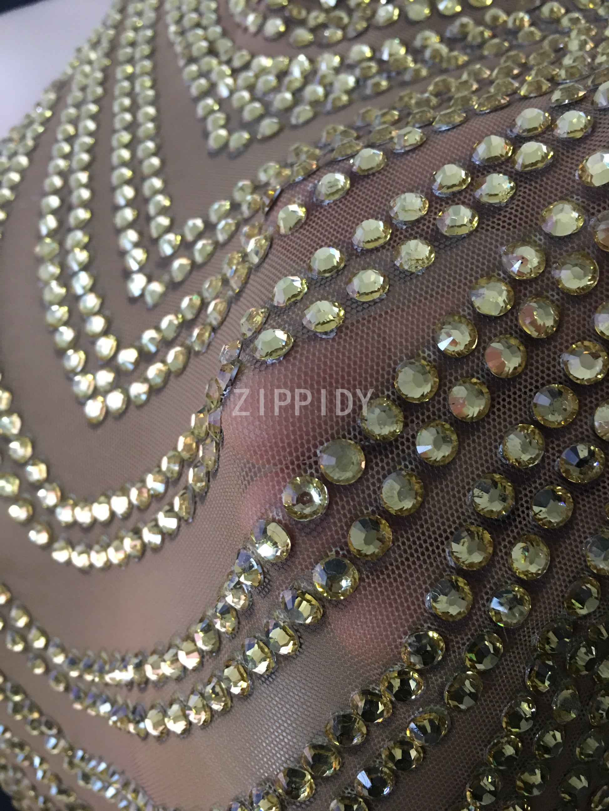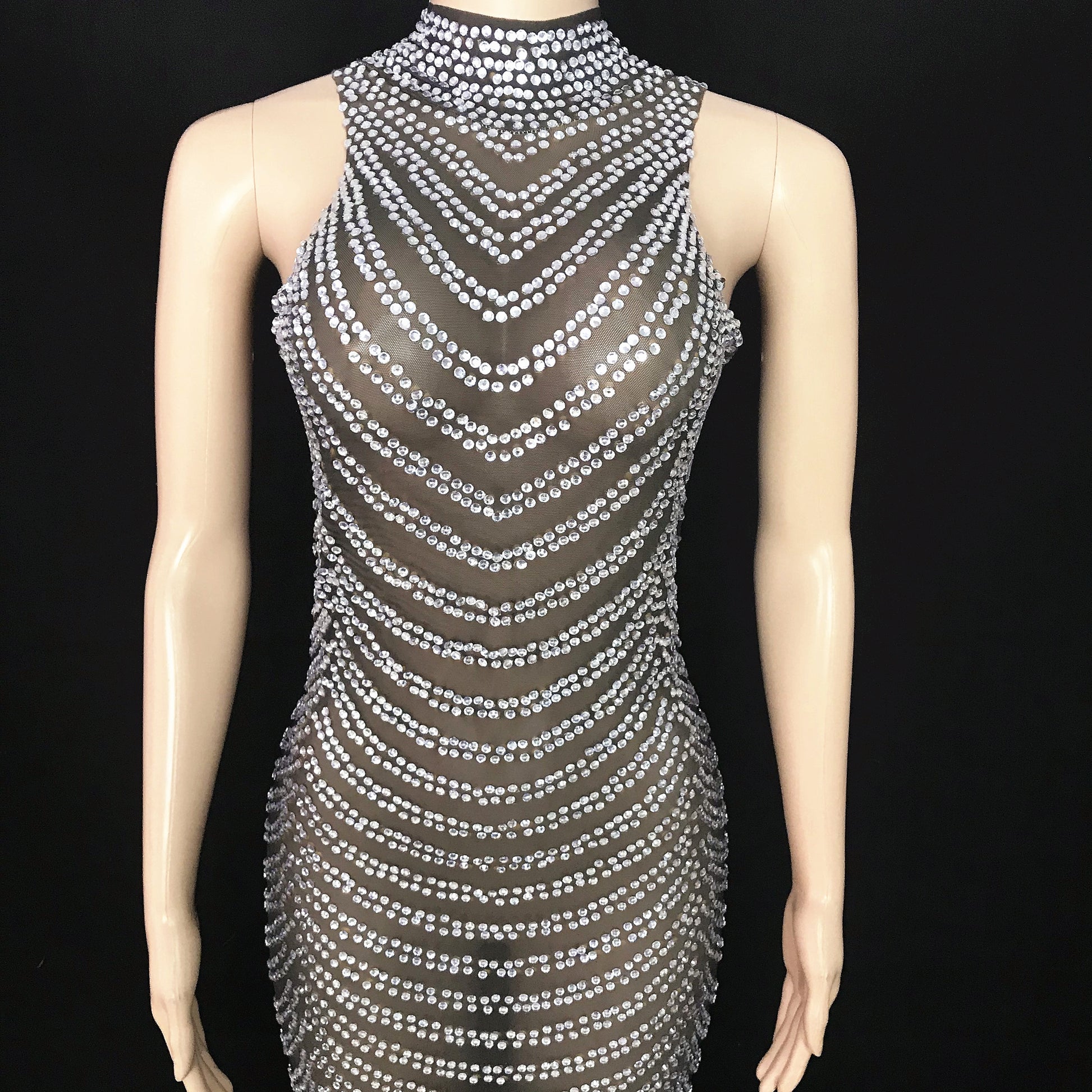 Gold Rhinestones Transparent Mesh Long Dress High Neck