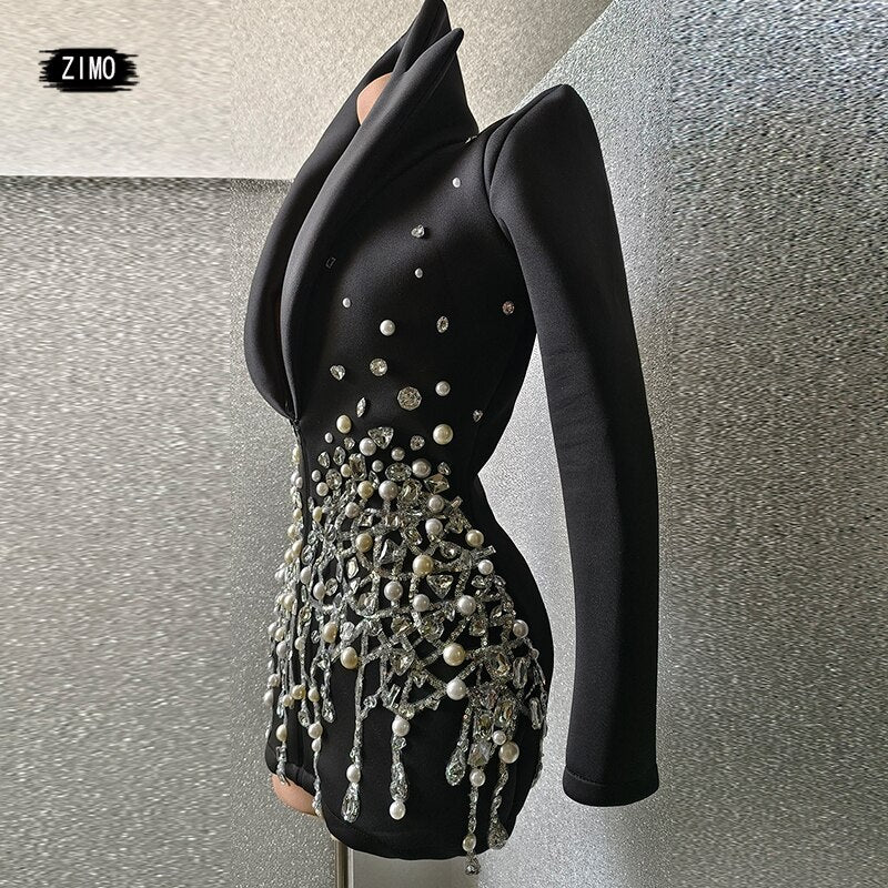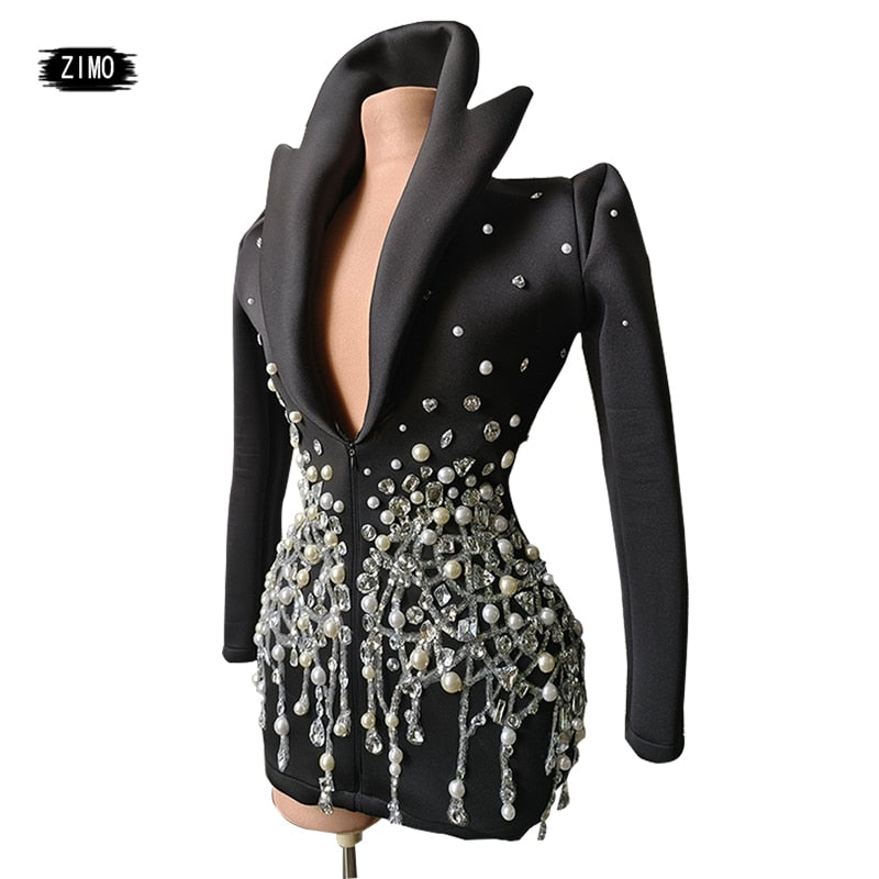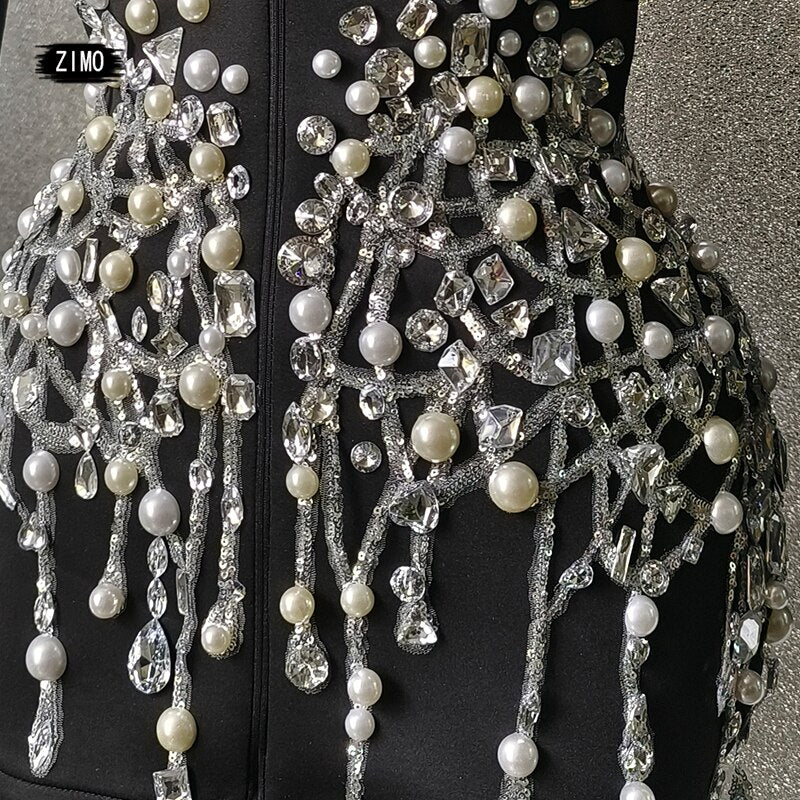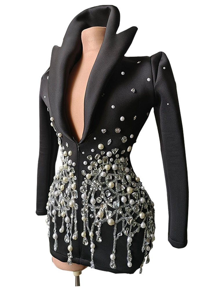 Fashion crystal rhinestone dress deep v neck sparkle black