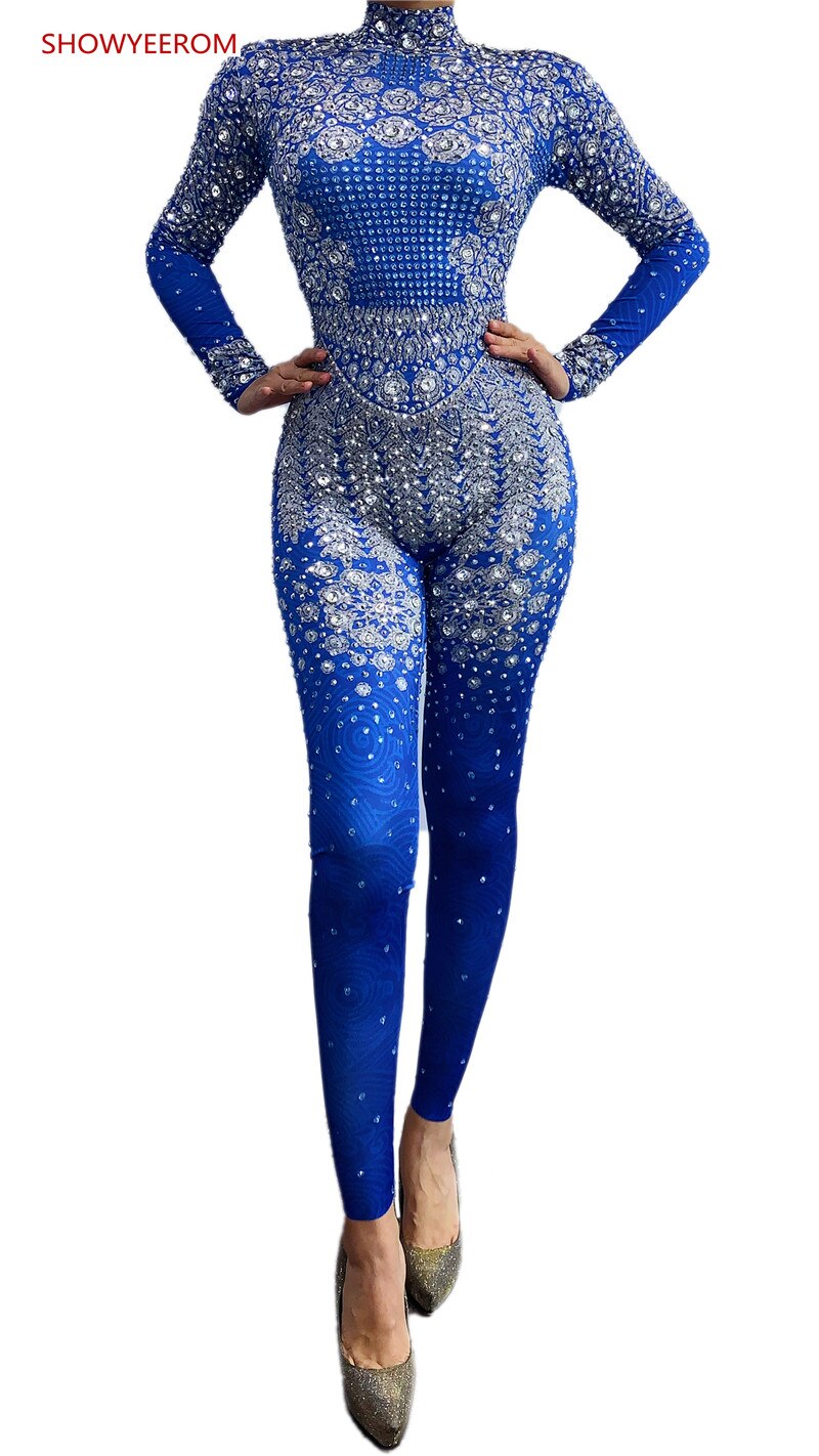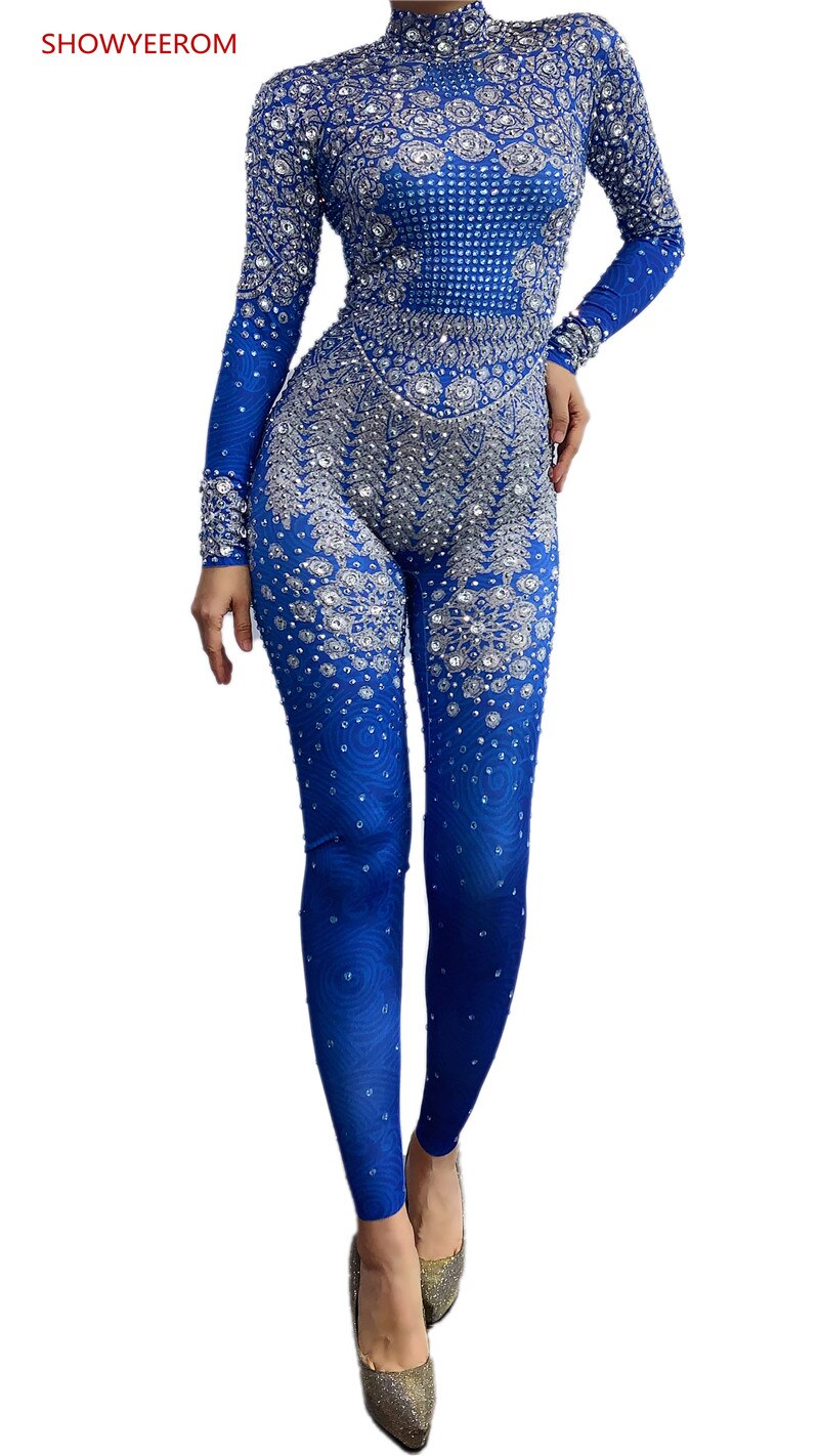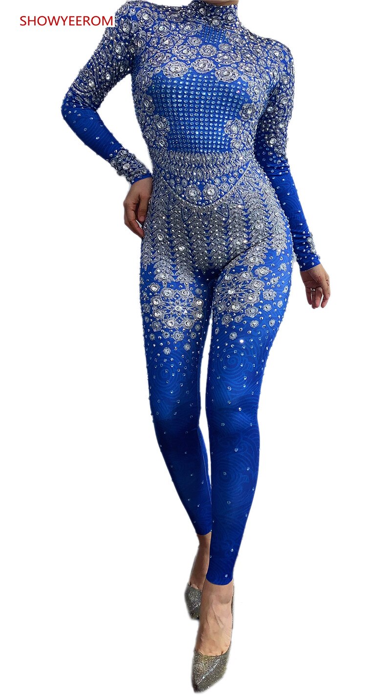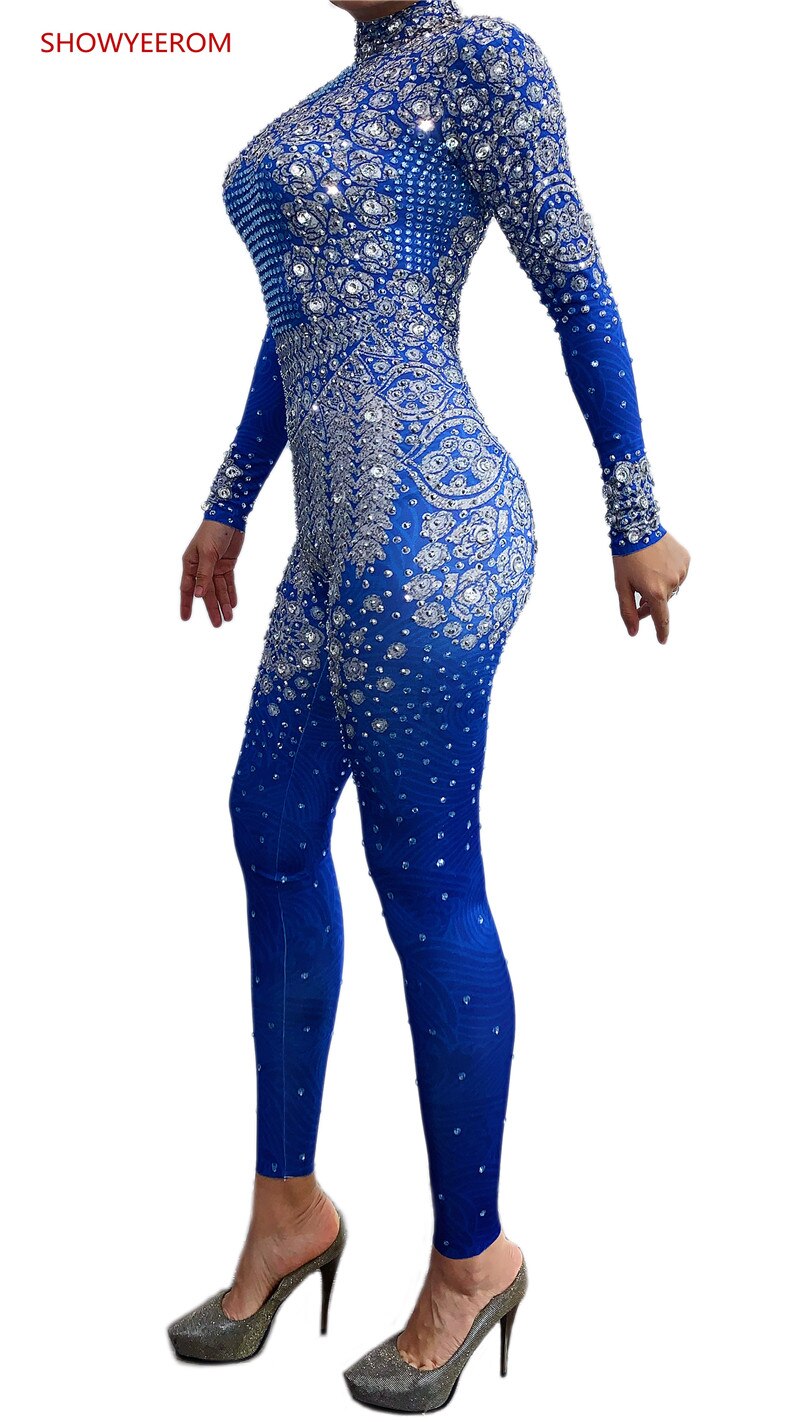 Rhinestones Jumpsuit long Sleeves Stretch Sexy Bodysuit