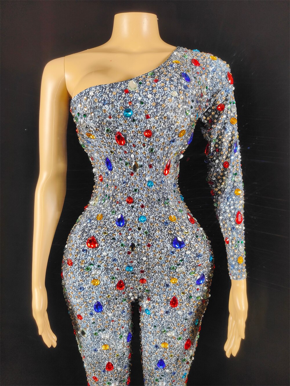 Rhinestones Jumpsuit long Sleeves Stretch Sexy Bodysuit